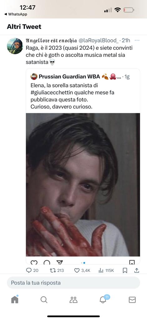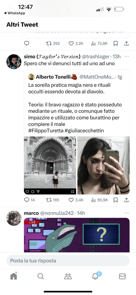 E poi quella felpa con certi simboli satanici aiuta a capire molto…spero che le indagini facciano chiarezza. Società patriarcale?? Cultura dello stupro?? Qui c’è dell’altro? Basta andare a vedere i suoi social e i dubbi diventano certezze. Il tentativo di quasi giustificare l’omicida dando la responsabilità alla “società patriarcale”. Più che società patriarcale dovremmo parlare di società satanista, cara ragazza. Sembra una che recita una parte di un qualcosa predeterminato e precostituito. Forse mi sbaglio ed è solo la mia suggestione… (le foto che pubblico sono tratte dal profilo facebook della sorella intervistata e sono molto significative)”.